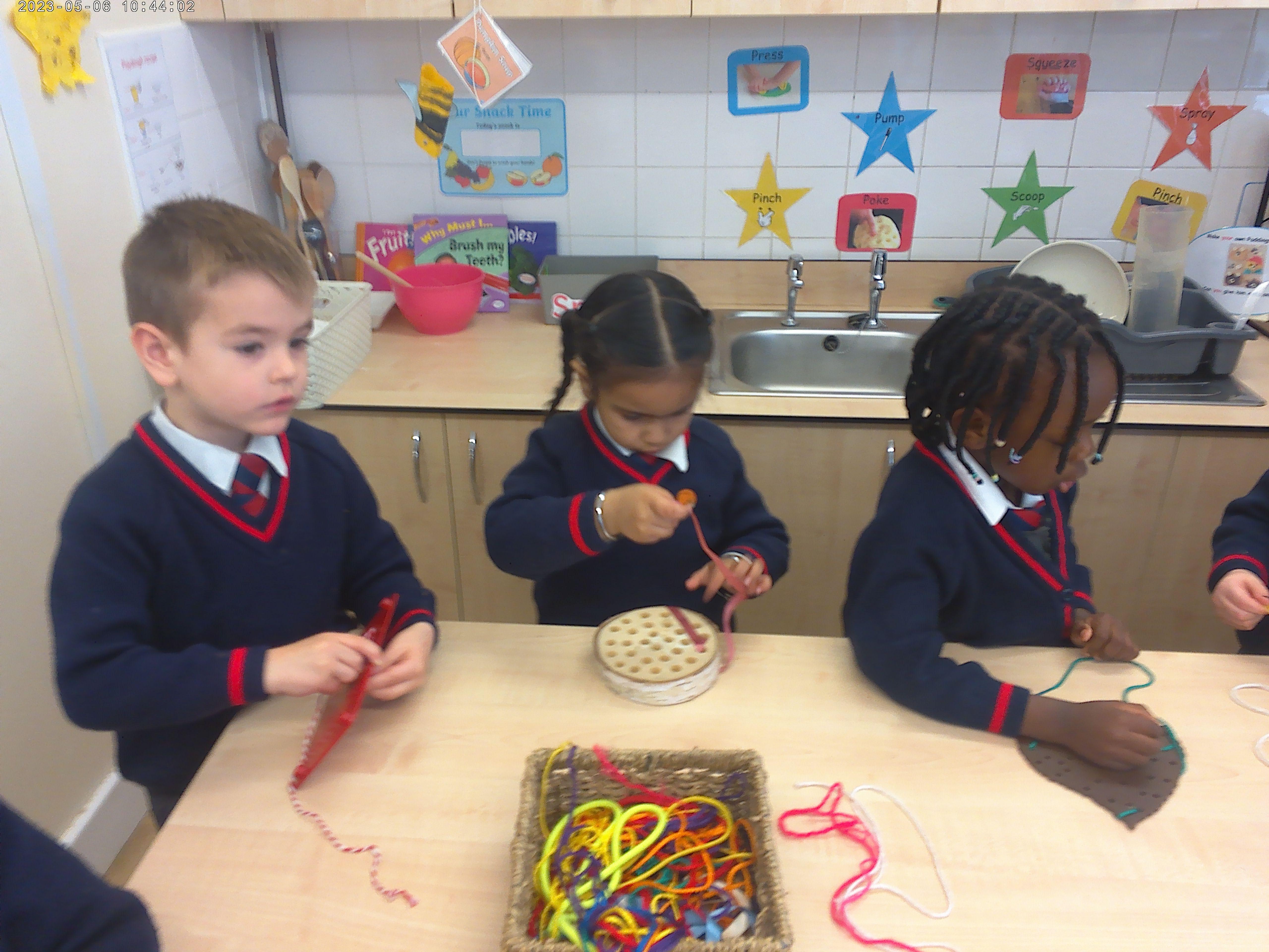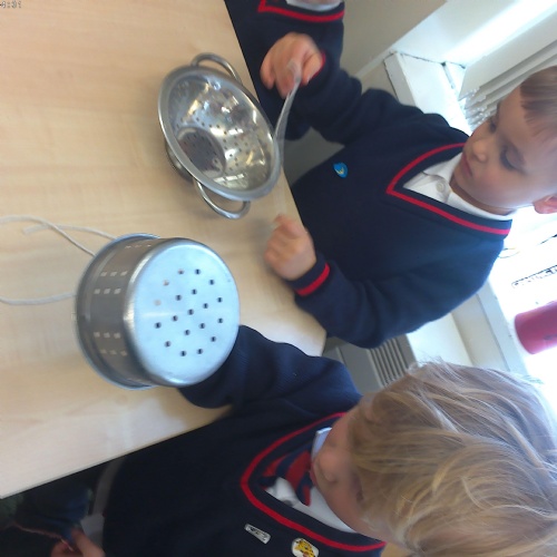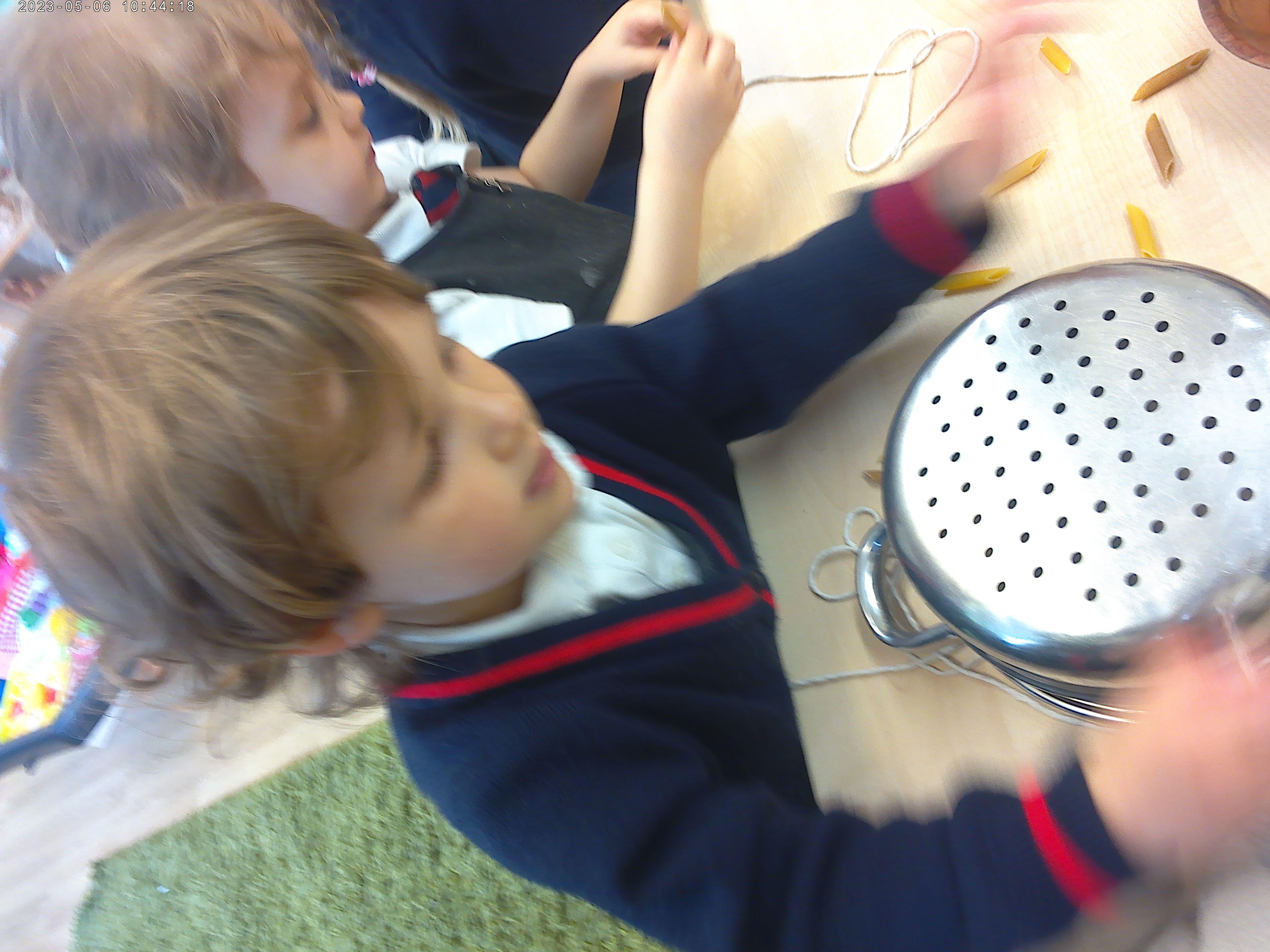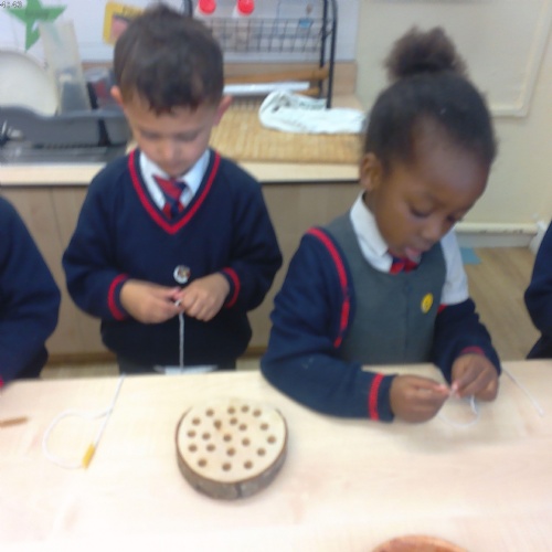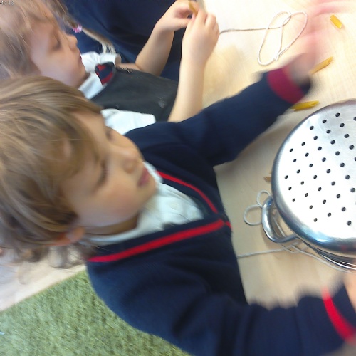Nursery have been practising their threading skills. We threaded pasta onto string, pipe cleaners through colanders and have been weaving in and out of punched holes.