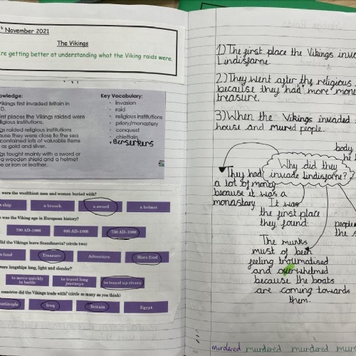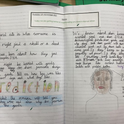 In Key Stage 2, the curriculum divides into two main strands. A study of Britain's past and a series of studies focussing on civilizations and people around the world. When studying British History, units are taught chronologically from the Stone Age in Year 3, to the Roman invasions and an in depth study into Roman Britain in Year 4, to the Anglo-Saxons, Scots and Vikings and ending with the Battle of Hastings in Year 5.