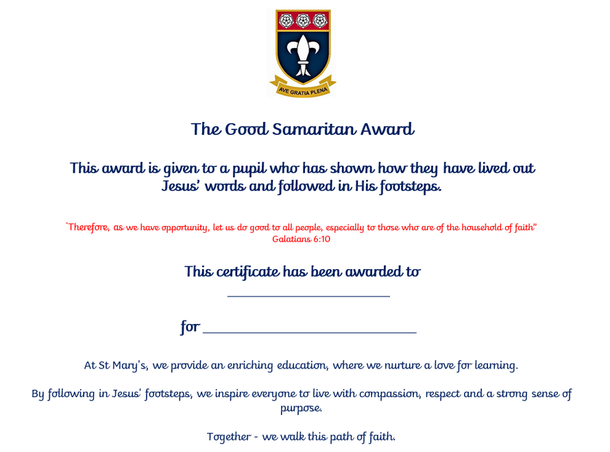 As part of living out The Gospel in our school, children are awarded a 'Good Samaritan' certificate where one child each week from the whole school is chosen for showing how they have lived out the Gospel values and by following in Jesus' footsteps by being kind, supportive and going the extra mile to help each other. It is a special certificate and one that all the children try their very best to earn!